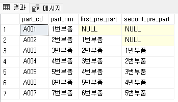 LEAD 와 OVER(ORDER BY parts_cd) 로 1번 부품의 다음 정렬인 2번 부품이 next_part 로 보여지게 된다. 첫번째 다음 로우가 아닌 두번째 로우를 가져오는 것도 가능하다.