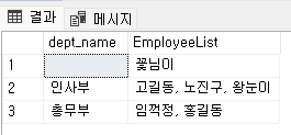 부서별로 부서에 포함된 담당자를 하나의 컬럼 ( EmployeeList ) 에 콤마로 (,) 구분지어 모두 표기하였다.